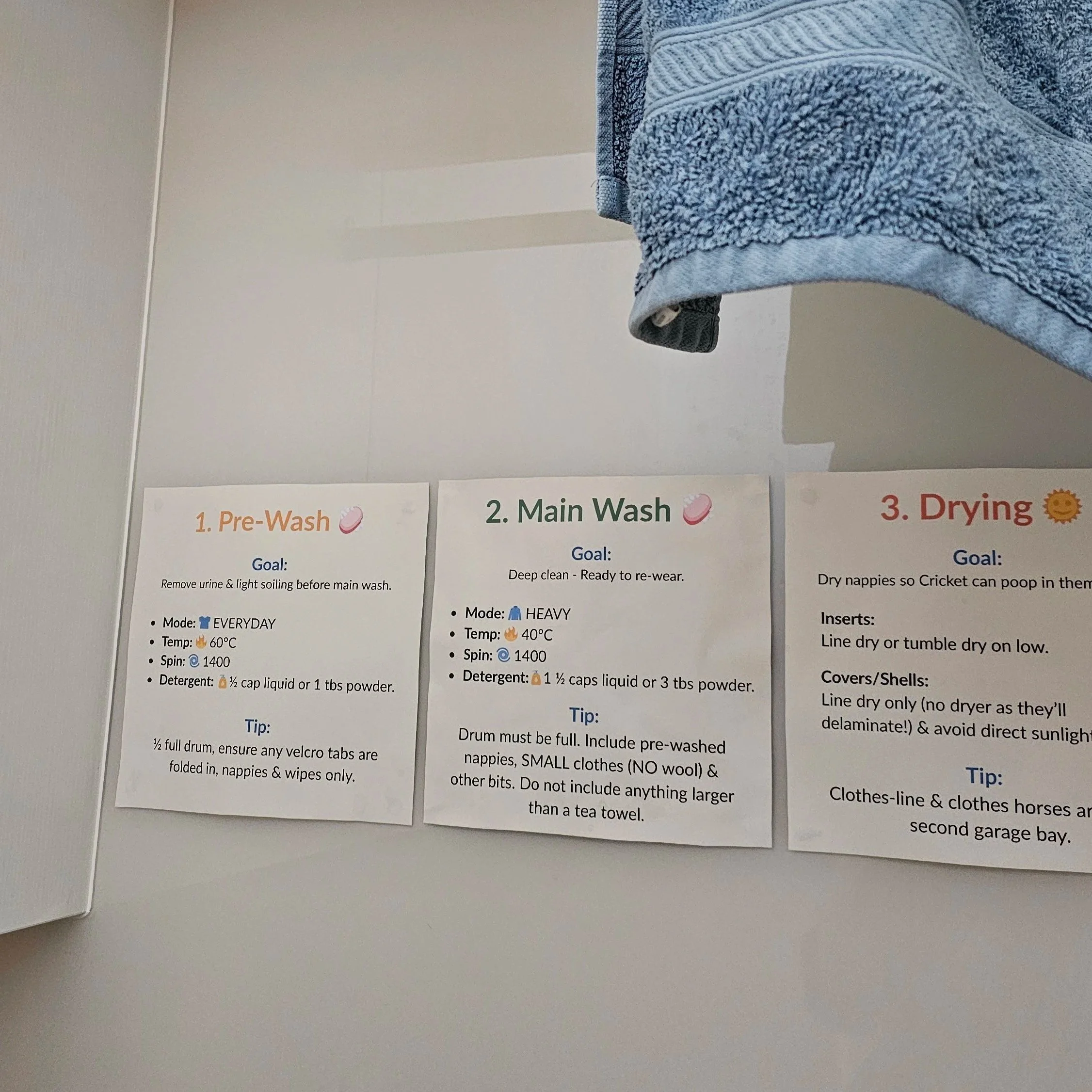One of the main tools that helped me, especially in early post-partum, was having printed instructions up in my laundry.