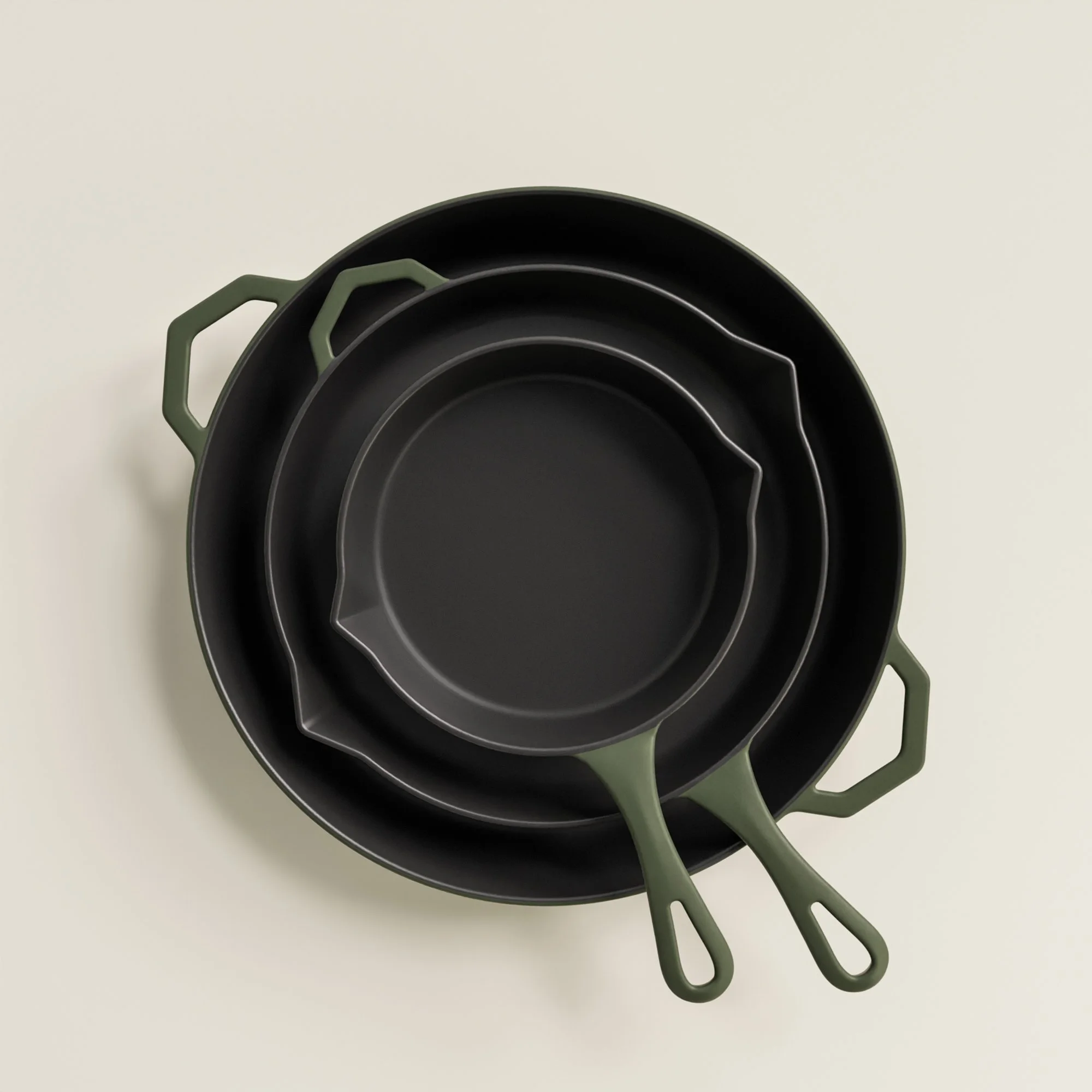 Colours of Home by Ironclad Co includes handcrafted iron in easy acre satin enamel. The strength and heat retention of Ironclad cast iron, sealed in a satin enamel finish that cleans with soap and never needs seasoning. In three enduring colours inspired by things that stay. Naturally non-stick, soap friendly, induction ready, and oven safe to 300°C. Available in Salt Stone, Olive Leaf, and Antique Black. Enduring colours chosen to feel at home. For generations.